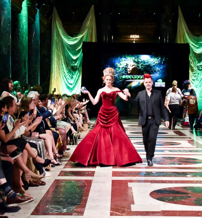 Near the end, event curator Brian David’s model/muse Joanna Wentling walked his couture gown design made of recycled red velvet fabric from the Carnegie Music Hall’s auditorium seats and an array of crystals, donated by Michael Volpatt via Carnegie Museum and Volpatt Construction.
